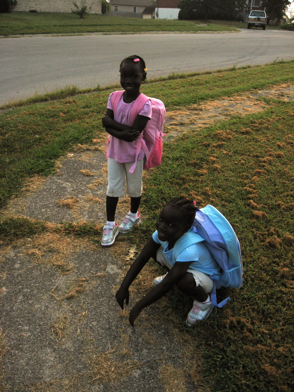 I feel like writing that "Today is a day that will live in infamy!" The girls started Kindergarten and when I came in from getting them on the bus (after waiting 25 minutes), I had a note from our agency director that said Matt had picked up the boys from the transition house. Too many emotions to write about now but here are some great pics of the girls getting ready for school.