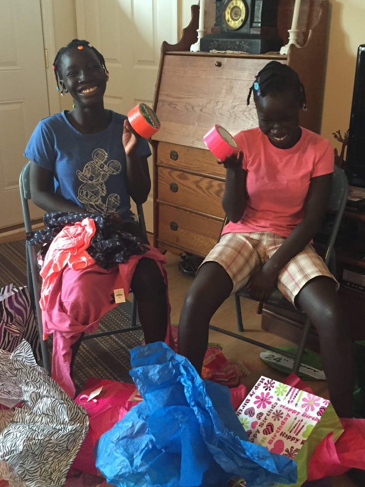 The other thing the girls are really into now - duct tape. They like to make flowers and wrap school binders in colorful duct tape. This was the gift from their brother. As you can see, they are getting a bit slap-happy at this point.